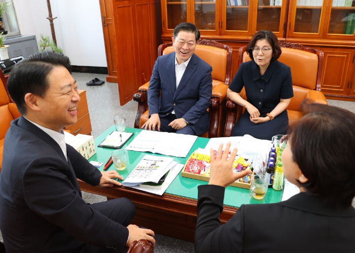 ▲ 박승원 광명시장이 9일 오전 국회에서 김영호 국회교육위원장과 만나 지자체 평생학습에 대한 정부 지원 확대를 위한 면담을 가졌다. 사진 왼쪽 아래 부터 시계방향으로 김영호 교육위원장 박승원 광명시장 김보라 안성시장. 김미경 은평구청장. |