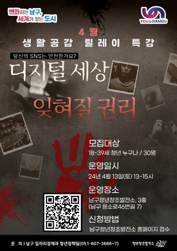 [뉴스서치] 부산 남구는 디지털 시대에 개인 사생활과 개인정보 보호에 대한중요성을 강조하고, 청년들이 자신의 디지털 기록을 효과적으로 관리할 수 있는방법을 알려주기 위한“디지털 피해 방지 잊혀질 권리!”를 주제로 특강을 개최 한다고 25일 밝혔다.