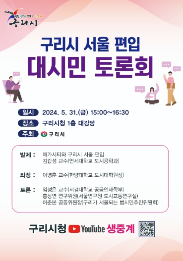이번 토론회에서는 구리시의 서울 편입에 따라 예상되는 행정, 도시, 교통 등 각 분야별 이슈 및 해결 과제에 대해 이명훈 한양대학교 교수를 좌장으로 하고, 김갑성 연세대 교수의 발제를 시작으로, 임성은 서경대 교수와 홍상연 서울연구원 연구위원, 이춘본 구리가 서울되는 범시민추진위 공동위원장이 토론을 진행한다. 또한 많은 시민이 참여할 수 있도록 구리시청 유튜브를 통해 생중계로 진행될 예정이다.