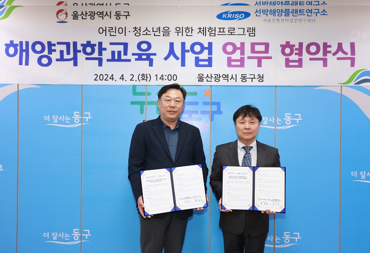 [뉴스서치] 울산 동구 4월 2일 오후 2시 동구청에서 선박해양플랜트 연구소 자율운항선박실증연구센터(동구 고늘로 108) 관계자들이 참석한 가운데 어린이·청소년을 위한 체험프로그램인 해양과학교육 사업에 대한 업무 협약을 체결했다.
