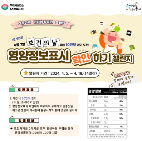 [뉴스서치] 구리시는 제52회 '보건의 날(4.7.)'을 맞아 4월 5일부터 4월 18일까지 ‘영양정보표시 확인하기 챌린지’를 운영한다.