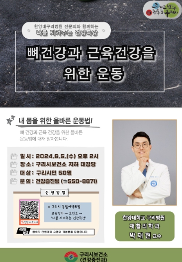 이번 특강은 6월 5일 오후 2시부터 구리시보건소 대강당에서 박재현 한양대학교 구리병원 재활의학과 교수가 ‘뼈 건강과 근육 건강을 위한 운동’을 주제로 강의를 진행한다. 이번 강의는 시민과 직접 소통하는 방식으로 1시간 동안 진행될 예정이다.