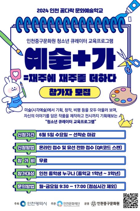 꿈다락 문화예술학교 참여자 접수는 6월 5일 수요일부터 시작하며, 인천지역 내 중학생이라면 누구나 무료로 참여할 수 있다.