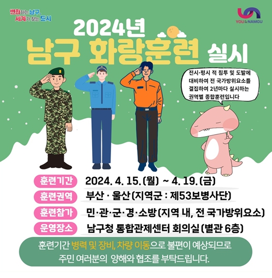 부산 남구는 통합방위지원본부 통제 아래 제6339부대 1대대, 남부소방서, 남부경찰서 등 지역 내 전 국가방위기관들과 함께 통합방위 작전계획의 시행 절차 숙달과 상황 대응능력 강화에 중점을 두고 화랑훈련을 지원할 예정이다.
