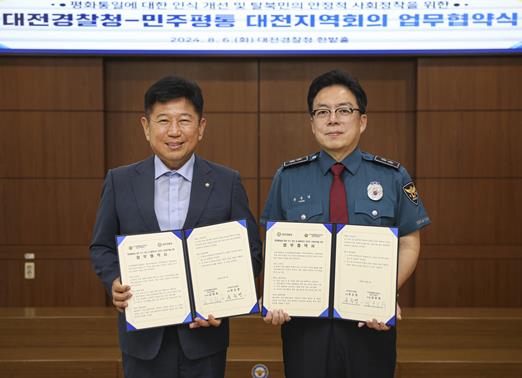 [뉴스서치] 대전경찰청은 6일 민주평화통일자문회의 대전지역회의와 업무협약을 체결하고 평화통일에 대한 시민들의 인식 개선과 북한이탈주민들의 안정적인 사회 정착을 위한 상호 교류 협력에 나선다.
