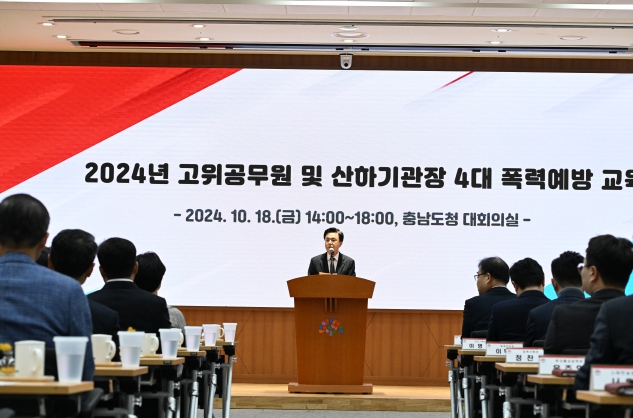 [뉴스서치] 충남도는 18일 도청 대회의실에서 ‘2024년 고위 공무원·산하 기관장 4대 폭력 예방 교육’을 진행했다.