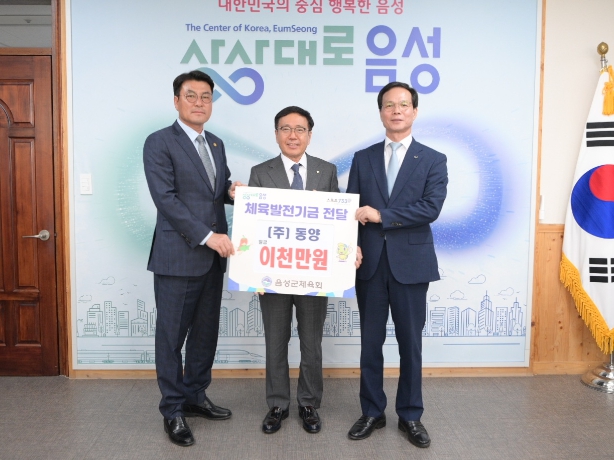 [뉴스서치] 음성군과 음성군체육회(회장 김기창)는 주)동양 정진학 대표이사가 8일 음성군청을 방문해 조병옥 군수와 김기창 음성군체육회장에게 ‘체육발전기금’2천만원을 전달했다고 밝혔다.