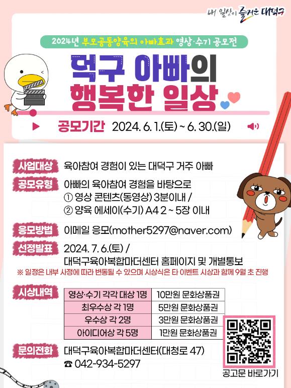 참가 대상은 대덕구에 거주하며 육아에 참여한 경험이 있는 아빠라면 누구나 참여할 수 있으며, 3분 이내의 영상 콘텐츠로 편집하거나 양육 수기를 작성해 제출하면 된다.
