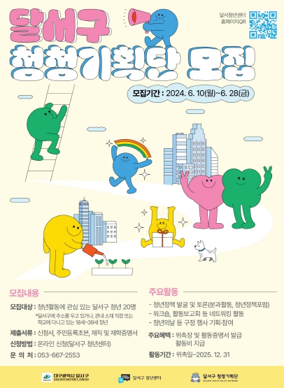 [뉴스서치] 대구 달서구가 6월 10일부터 28일까지 관내 주소를 두고 있거나 직장 또는 학교에 다니고 있는 18~39세 청년을 대상으로'달서구 청청(靑聽)기획단'을 공개 모집한다.