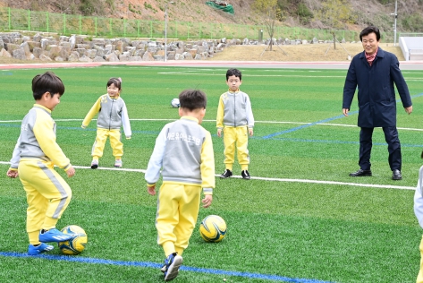 2일 스포츠가치센터 야외 풋살장에 깜짝 방문한 조규일 진주시장은 풋살 활동 규칙, 공차는 법을 집중하며 배우고 있는 하모 유아스포츠단 어린이들을 응원했다.