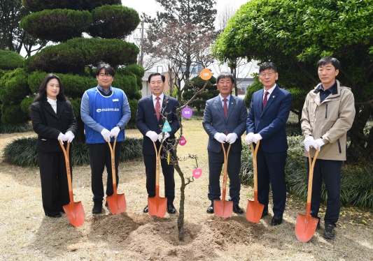▲ 성낙인 군수와 창녕군의회 의장, 공무원 및 공무직 노조위원장이 청렴나무를 심고 있다 |