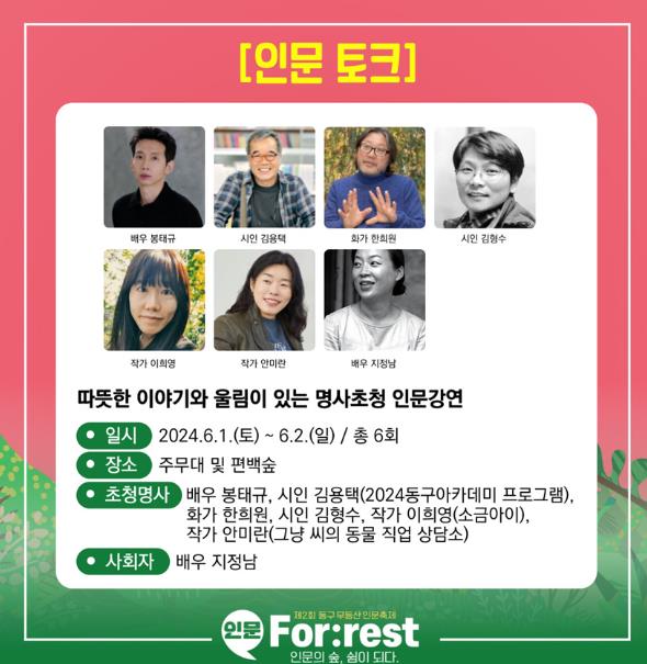 인문토크는 축제 주무대 광장과 편백숲에서 진행되며, 광주를 대표하는 대중예술인 배우 지정남이 사회자로 나선다.