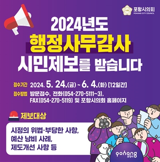 [뉴스서치] 포항시의회는‘2024년도 행정사무감사’를 앞두고 오는 24일부터 다음 달 4일까지 12일간 시민제보를 접수받는다고 밝혔다.