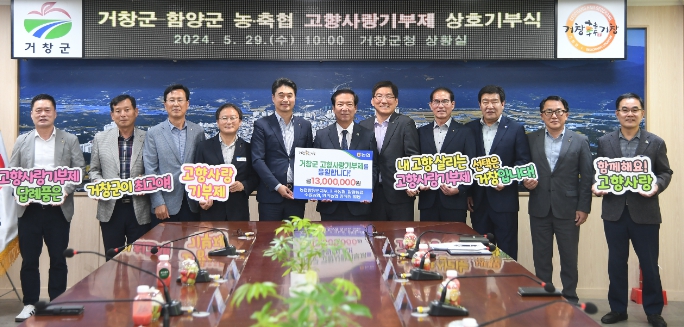 [뉴스서치] 거창군은 지난 29일 거창 4개 농·축협(농협 거창군지부, 수승대농협, 거창사과원예농협, 거창축협)과 함양 5개 농협(농협 함양군지부, 지곡농협, 함양농협, 수동농협, 안의농협) 임직원 260여 명이 고향사랑기부제의 활성화와 두 지역의 상생발전을 응원하며 각 1300만 원을 상호 기부했다고 전했다.