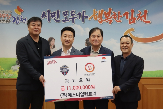 김천상무프로축구단(대표이사 배낙호)이 11일 김천시청에서 (주)에스비일렉트릭과 2년 연속 광고후원 협약을 진행했다. 행사에는 김천상무 김충섭 구단주가 자리했으며, (주)에스비일렉트릭 서석년 대표이사, (주)삼백태양광 김대견 대표이사와 김천상무 배낙호 대표이사, 이재하 단장이 참석했다.