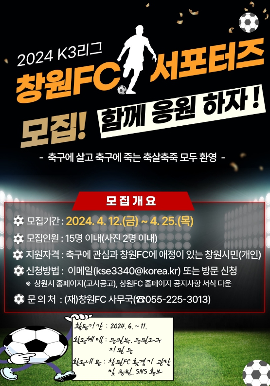 이번 모집은 창원FC가 공식적인 서포터즈를 구성하는 첫 번째 시도로, 선수단의 사기를 높이고 활기찬 경기장 분위기를 조성하여 모두가 즐길 수 있는 홈경기 운영을 목표로 한다.