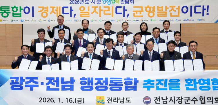 [뉴스서치] 전라남도는 16일 전남도청 왕인실에서 ‘2026년 도-시군 상생협력 간담회’를 열어 지역 대도약을 위한 광주·전남 행정통합 추진에 도와 22개 시군이 공동 보조를 맞추기로 했다.
