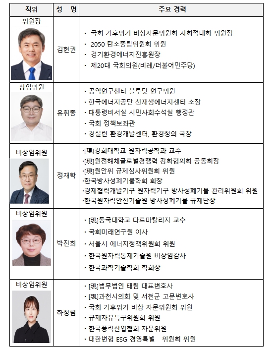 | ▲ 고준위 방사성폐기물관리위원회 위원 및 주요 경력 |