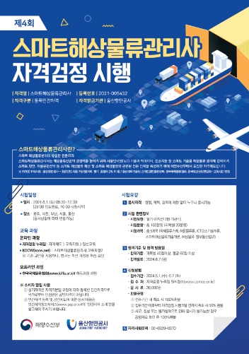 [뉴스서치] 해양수산부와 울산항만공사(사장 김재균)는 5월 1일부터 5월 7일까지 ‘제4회 스마트 해상물류 관리사’ 자격시험 원서접수를 실시한다.