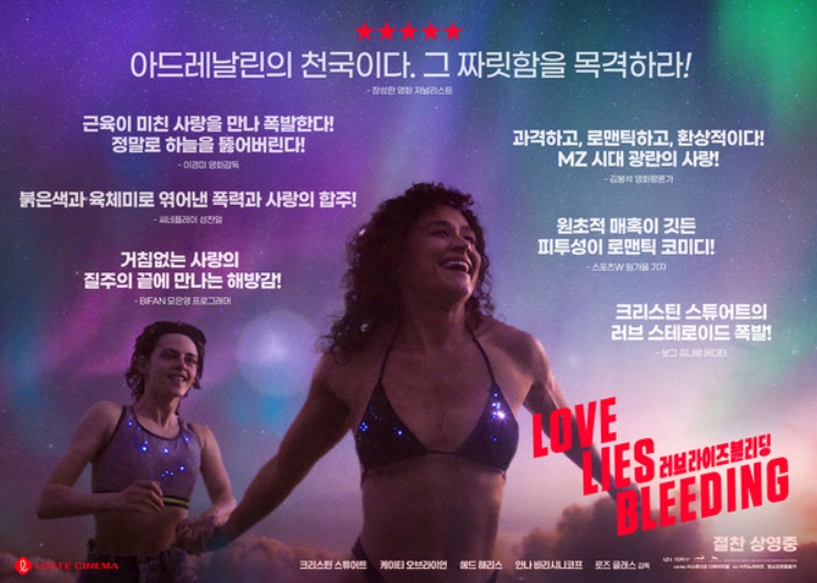 MZ 시대 광란의 사랑!” (김봉석 영화평론가), “원초적 매혹이 깃든 피투성이 로맨틱 코미디!” (스포츠W 임가을 기자), “크리스틴 스튜어트의 러브 스테로이드 폭발!” (보그 김나랑 에디터) 등 국내 언론 매체들의 찬사가 담겨 있어 기대를 더한다.