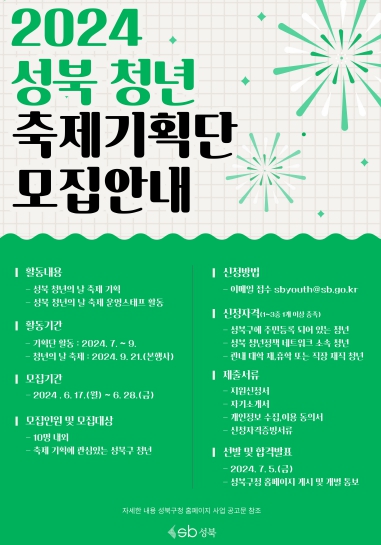 모집대상은 축제 기획에 관심 있는 성북구 청년으로, 신청 자격(성북구에 주민등록 되어 있는 청년, 성북 청년정책 네트워크 소속 청년, 성북구 소재 대학교 재학 또는 휴학 청년, 성북구 소재 직장 재직 청년) 중 1개 이상 해당되는 경우 지원할 수 있다. 기획단에 지원하고 싶은 청년은 성북구 홈페이지에 게재된 제출서류를 작성하여 이메일로 접수하면 된다.