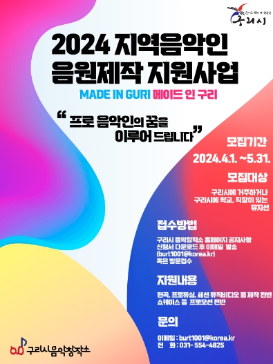 [뉴스서치] 구리시는 4월 1일부터 5월 31일까지 구리시 음악창작소에서 2024년 지역 아마추어 뮤지션 음원제작 지원사업인 ‘Made in Guri’ 참여자를 모집한다.