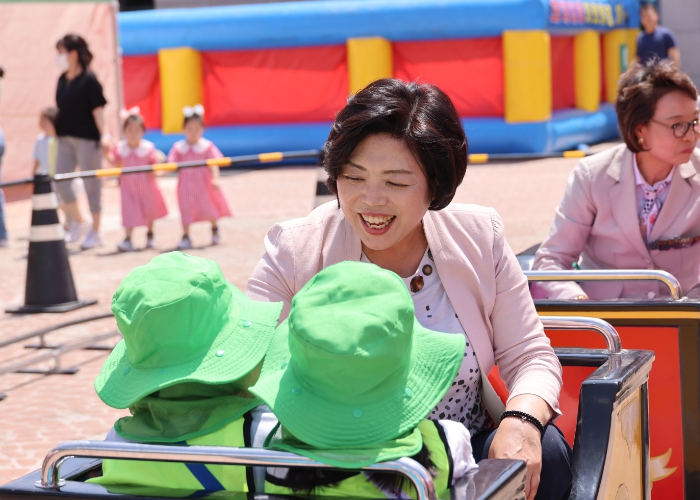 ▲ 신계용 과천시장이 2023년 5월 열린 과천시 어린이 안전축제에서 어린이들과 웃으며 대화하고 있는 모습 |