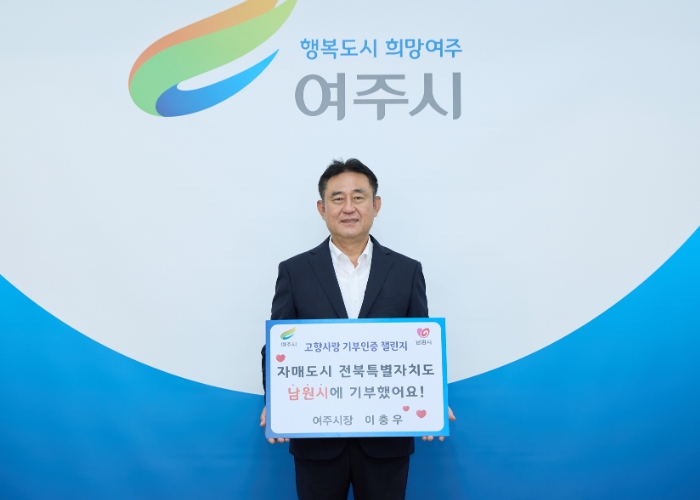 [뉴스서치] 이충우 경기도 여주시장이 지난 7월 9일 ‘고향사랑 기부제 활성화를 위한 ‘고향사랑 기부 인증챌린지’에 동참했다. 이는 자매도시인 서울시 중구 김길성 구청장의 지명을 받은 챌린지 참여로, 다음 주자로는 여주시 자매도시 전북특별자치도 남원시의 최경식 시장을 지명했다.