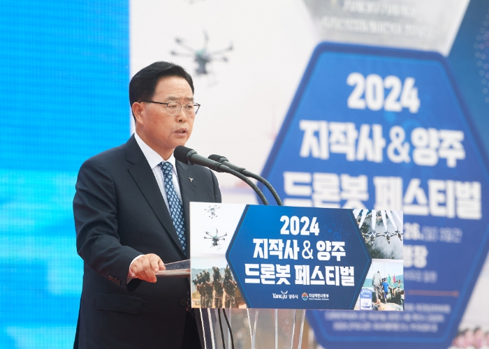 ▲ ‘2024 양주시 x 지작사 드론봇 페스티벌’ 개막식에 축사하는 강수현 양주시장 |