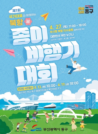 [뉴스서치] 부산 동구는 오는 4월 27일 북항친수공원(문화공원1호)에서 색다른 봄축제 ‘북항 종이비행기 페스티벌'을 개최한다고 밝혔다. 행사는 오전 11시부터 오후 6시까지 열리며, 종이비행기 날리기 대회, 공연, 체험활동 등 다채로운 프로그램으로 구성된다.