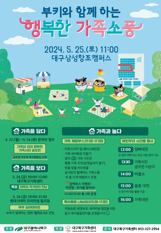 5월 가정의 달을 맞이하여 가족의 의미를 되새기고 함께하는 돌봄 문화 조성을 위한 가족축제 '부키와 함께하는 ‘행복한 가족소풍’'을 5월 25일 11시부터 17시까지 삼성창조캠퍼스 야외공연장 일원에서 개최한다.
