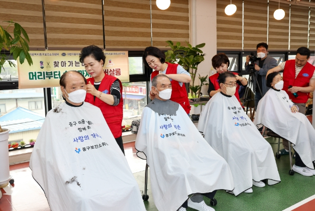 [뉴스서치] 대구 중구는 7일 어르신마을 노인복지센터(서성로 96, 3층)에서 (사)미용사회 중구지부, 네일 대구지회 회원 등이 참석한 가운데 관내 거동이 불편한 어르신 대상으로 찾아가는 미용봉사 ‘머리부터 손끝까지 실버살롱’을 진행했다.