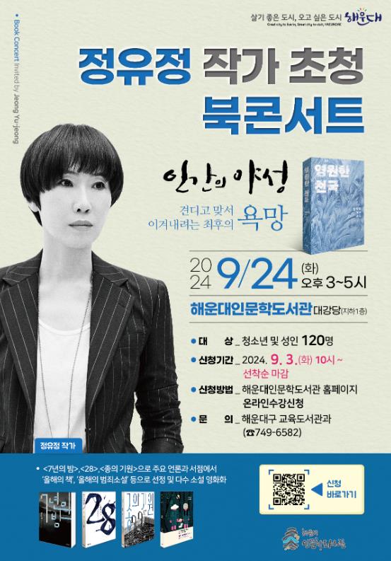 [뉴스서치] 해운대인문학도서관은 오는 9월 24일 오후 3시부터 5시까지 지하 대강당에서‘정유정 작가 초청 북콘서트’를 개최한다.
