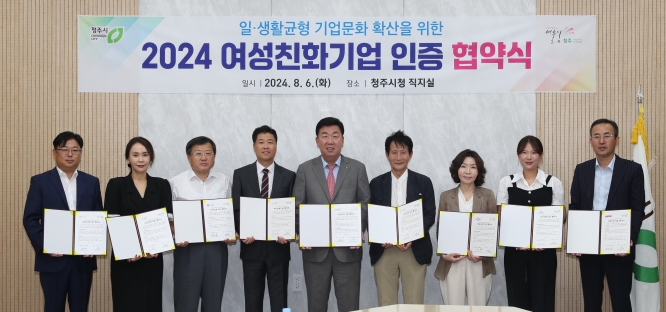 [뉴스서치] 청주시는 6일 임시청사 직지실에서 여성친화기업으로 선정한 8개 기업과 인증 협약을 체결했다.
