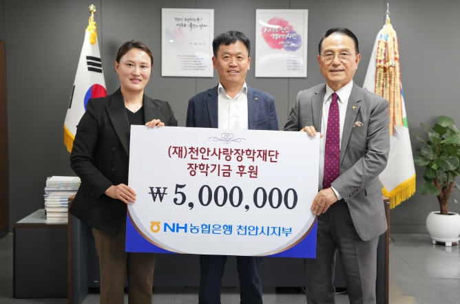 [뉴스서치] NH농협은행 천안시지부는 20일 천안시청을 방문하여 지역인재 육성 및 어려운 학생들을 위해 장학기금 500만 원을 (재)천안사랑장학재단에 기탁했다.