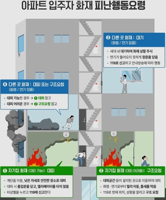울진소방서에 따르면 공동주택 화재 발생 시 ‘불나면 살펴서 대피’ 수칙에 따라 화재 상황별 대피요령을 숙지하는 것이 중요하다고 밝혔다.