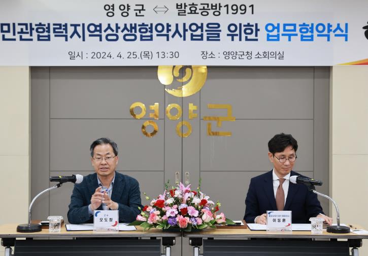 오도창 영양군수는 “이번 업무협약은 민간과 공공이 협력하여 인구소멸 위기에 공동 대응하고 상생의 길을 찾는 것으로 그 의미가 남다르다며 민간의 창의성과 전문성이 사업에 십분 발휘될 수 있도록 협력하여 발효공방1991과 함께 지역경제 활성화와 생활 인구 유입에 최선을 다하겠다.”라고 밝혔다.