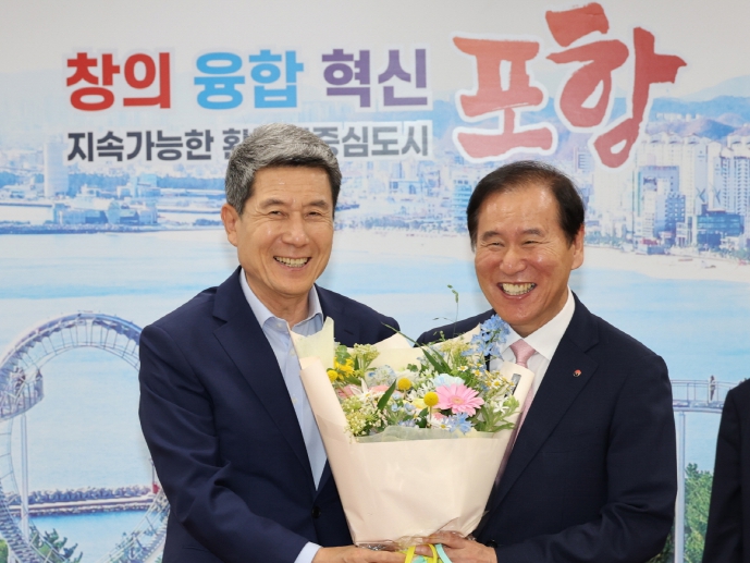 ▲ 이강덕 포항시장이 28일 포항시청을 방문한 김동섭 한국석유공사 사장을 만나 동해 심해 가스전 개발 사업과 관련한 진행 상황에 대한 의견을 청취했다. |