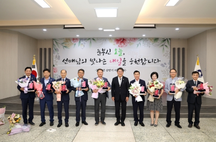 이날 행사는 임주택 복지국장, 김치성 시민안전국장, 강삼성 상하수도사업소장, 강한순 전 허가민원과장(퇴직준비교육 복귀), 김관호 건축과장, 김수철 공동주택과장, 김금남 서부보건소 위생과장, 강치희 명동정수과장, 박 선 체육지원과장 등 9명의 이·퇴임 공무원과 가족, 후배 공무원 등 200여명이 참석한 가운데 이뤄졌다.