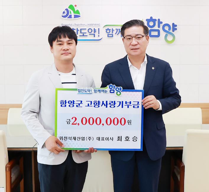[뉴스서치] 함양군을 아끼고 사랑하는 마음을 담아 최호승 거창 위천석재산업(주) 대표이사가 고향사랑기부제에 고액(200만 원)의 기부금을 전달했다.