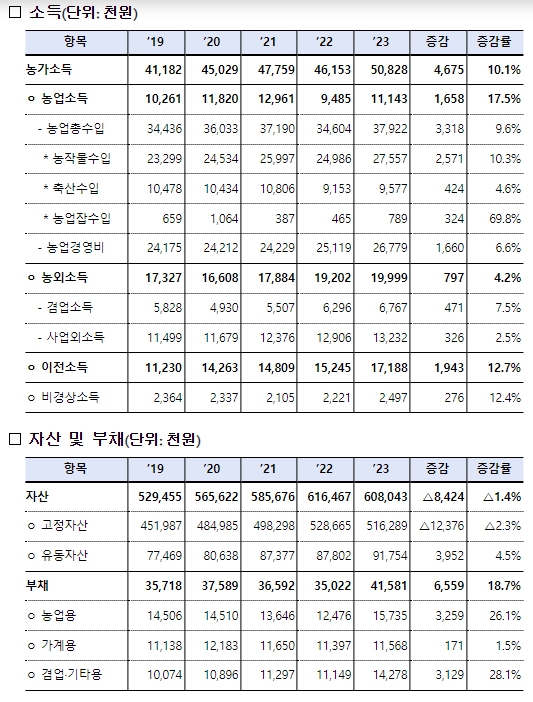 [자산·부채] 2023년말 기준 농가의 평균 자산은 농지가격 하락 등의 영향으로 인해 6억 804만원으로 전년 대비 1.4% 감소했다. 농가 부채는 전년 대비 18.7%(656만원) 증가한 4,158만원을 기록했는데, 대부분 농업용(↑326만원) 및 겸업 등(↑313만원) 목적으로 부채가 증가했다.