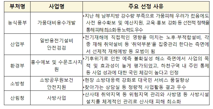 작년 남부지방 강수량 부족으로 가뭄피해가 우려됨에 따라 사전 용수확보 등 선제적 사업 집행을 통해 피해를 최소화했다. 또한, 주기적인 모니터링과 점검을 지속 추진하는 등 노력도 부분도 높게 평가받았다.