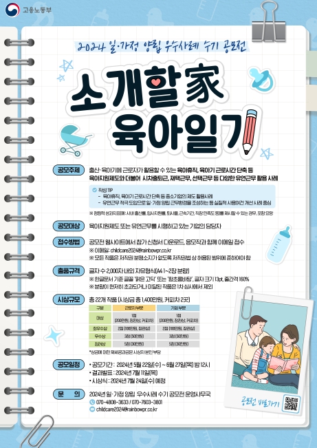 임영미 통합고용정책국장은 “이번 공모전이 중소기업에서 참고할 수 있는 다양한 활용사례를 발굴하여 일·가정 양립 분위기가 확산되는 계기가 되기를 바란다”라며, “아이와 함께 성장하는 부모, 기업의 다양한 사례를 들려주기를 기대한다”라고 밝혔다.