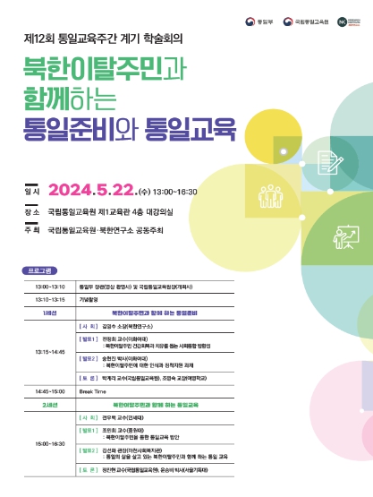 [뉴스서치] 국립통일교육원은 5월 22일 북한연구소와 공동으로 「북한이탈주민과 함께 하는 통일준비와 통일교육 학술회의」를 개최한다고 밝혔다.