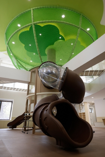 가장 큰 특징은 1, 2층 전체가 하나의 놀이코스로 이어지는 ‘경계 없는 놀이터’라는 점이다. 1~2층을 관통하는 6m 높이의 타워형 나무놀이대를 중심으로 어린이들이 암벽이나 계단에 올라 미끄럼틀을 타고, 흔들다리를 건널 수도 있다. 놀이기구에는 소나무 언덕을 뜻하는 ‘송파’의 정체성을 담았다.