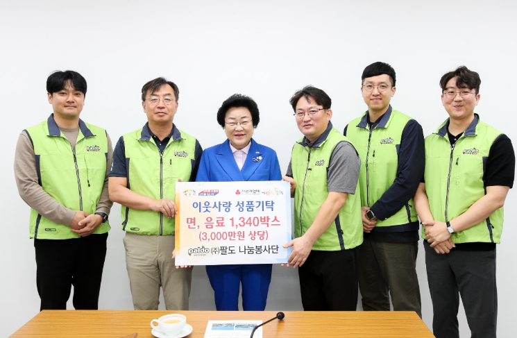 이번 성품은 봉사단 소속 팔도 직원들이 매 월급의 일정 금액을 모아 마련됐다. 5월 가정의 달을 맞이하여 이천시 지역아동센터 소속 아동에게 팔도 인기 제품 꾸러미 320개 (1,000만 원 상당), 기초생활수급자 독거노인 및 등록장애인에게 ‘왕뚜껑’,‘설렁탕면’ 1,100박스(2,000만 원 상당)을 전달했다.