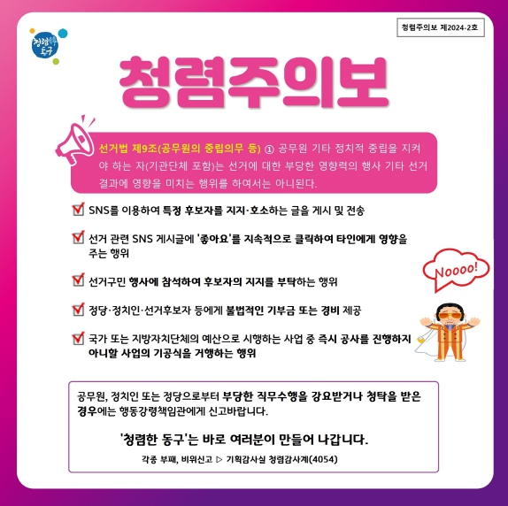 이번 청렴주의보는 공직자의 중립의무를 강조하며, 공직자가 하지 말아야 하는 행동(누리소통망(SNS)을 이용하여 특정후보자를 지지‧호소하는 글을 게시 및 전송, 선거구민 행사에 참석하여 후보자의 지지를 부탁하는 행위)을 담고 있다.