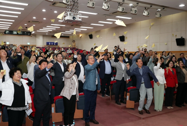 ▲ 30일 구청 대강당에서 주민자치회 위원 160명을 대상으로 역량강화 교육을 실시한 가운데, 정용래 유성구청장(왼쪽에서 네 번째)과 참석자들이 퍼포먼스를 하고 있다. |