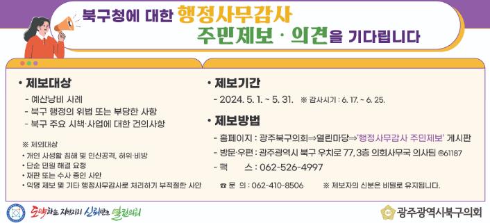 [뉴스서치] 광주 북구의회가 오는 6월 예정된 제294회 제1차 정례회 행정사무감사에 앞서 주민제보를 받는다고 밝혔다.