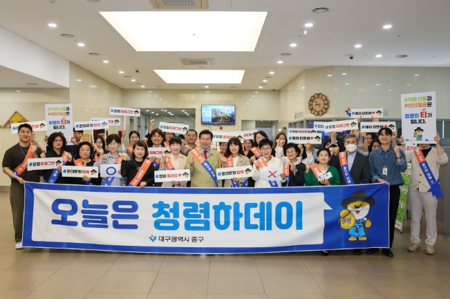 [뉴스서치] 대구 중구는 30일 출근시간에 맞춰 구청 1층 로비에서 중구 전 직원과 주민의 청렴 의식을 도모하기 위해 주민과 함께하는 청렴하데이 캠페인을 실시했다.